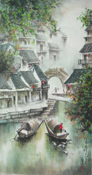 江南水鄉的詩情畫意,壹直是孫陽作品中最有特色的主題,也是他作品中典型風格的代表。他的作品多優美而少強悍,多舒展而少厚重,無論描繪什麼題材,筆端都洋溢著生命活力。尤其是他筆下的水鄉,無不流露著情真意濃的雅致與靈秀。江南有著讓人說不清道不明言不盡的風淒苦雨的歷史,有無法用文字來傾訴的柔情私語,有更多糾結於心暗藏於靈魂的文化遺跡。孫陽的作品,從某種程度上說,是對江南詩意文化傳統的挽救。在他的畫面中,沒有紅塵的喧囂和工業的嘈雜,只有幽靜的水鄉,白墻黑瓦的房舍掩映於蒼翠搖曳的竹林,或雨後春山、碧空如洗,或霧靄彌漫、暮色微茫,或溪橋流轉、漁帆片片。在他的筆下,江南回歸了傳統文化意義上的自然本體並在詩意的層次上復活,這是孫陽的詩意理想,也是他繪畫的意旨所在。這種詩意的繪畫,無疑給忙碌的現代人帶來了情感的慰藉。在日益狹窄的感情空間和日益緊張的生存狀態下,領略壹下孫陽的繪畫,的確是壹種身心俱釋的享受。水鄉的美是像水墨畫壹般美妙,令人在絲絲細雨中感受到它的神秘與美好。細細觀看孫陽的“晨曲”、“夢回水鄉”、“千裏煙雲”等江南水鄉畫,仿佛可以感受到江南水鄉的美景,給人清新明麗,通透的澄澈之感,畫者畫筆卓越,引人入勝,不僅表現出江南水鄉的迷人氣質,更是以親和的畫風令我們心生無限向往。書畫藝術是講求品味格調的,同洋也講求地域特色和民族情感,這種藝術手法的借鑒,情緒的共鳴感使得這種藝術深受不同國度人士的喜愛,也以更加多元化的發展呈獻給我們絕美的視覺享受和心靈震撼。孫陽的作品,把這種江南水鄉人家的靜謐和諧的美景表現得淋漓盡致。他的畫作充滿了水墨畫的色彩感,美不勝收,令人傾倒。畫面充滿濃濃的江南水鄉景色,區內窄街小巷,石橋駁岸、木舟水韻、色彩時清雅時俏麗,獨特的建築、淳樸的民風、柔媚的美景可以讓您盡情領略江南水鄉的古風余韻。這壹幅幅古樸經典的江南水鄉風情畫,仿佛在訴說著壹個不同的江南故事。